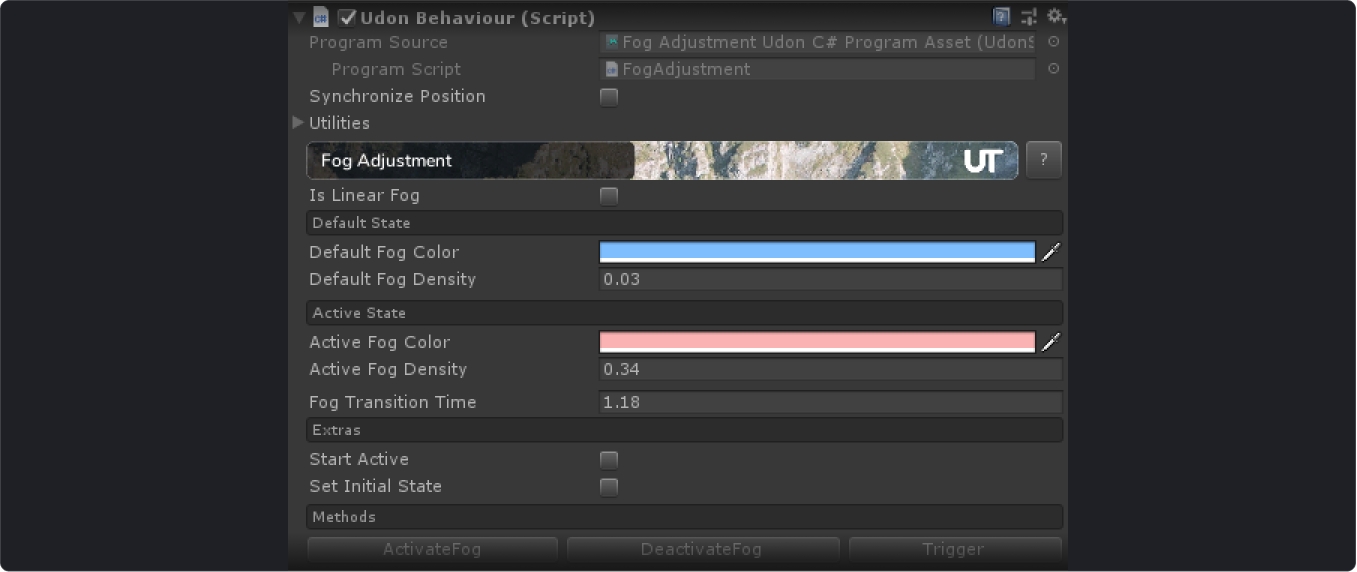 Start Active: Makes it, so the fog will start from the active state, so the first transition will be Active to Default, instead of the other way around