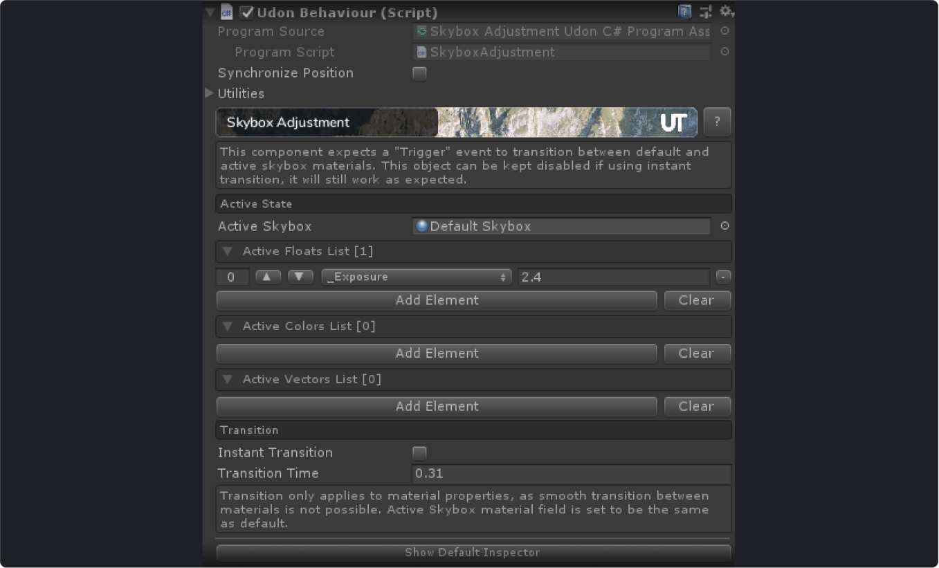 Transition Time: Defines the time, in seconds, over which the Float/Color/Vector3 values will be transitioned from default values to active and vice-versa