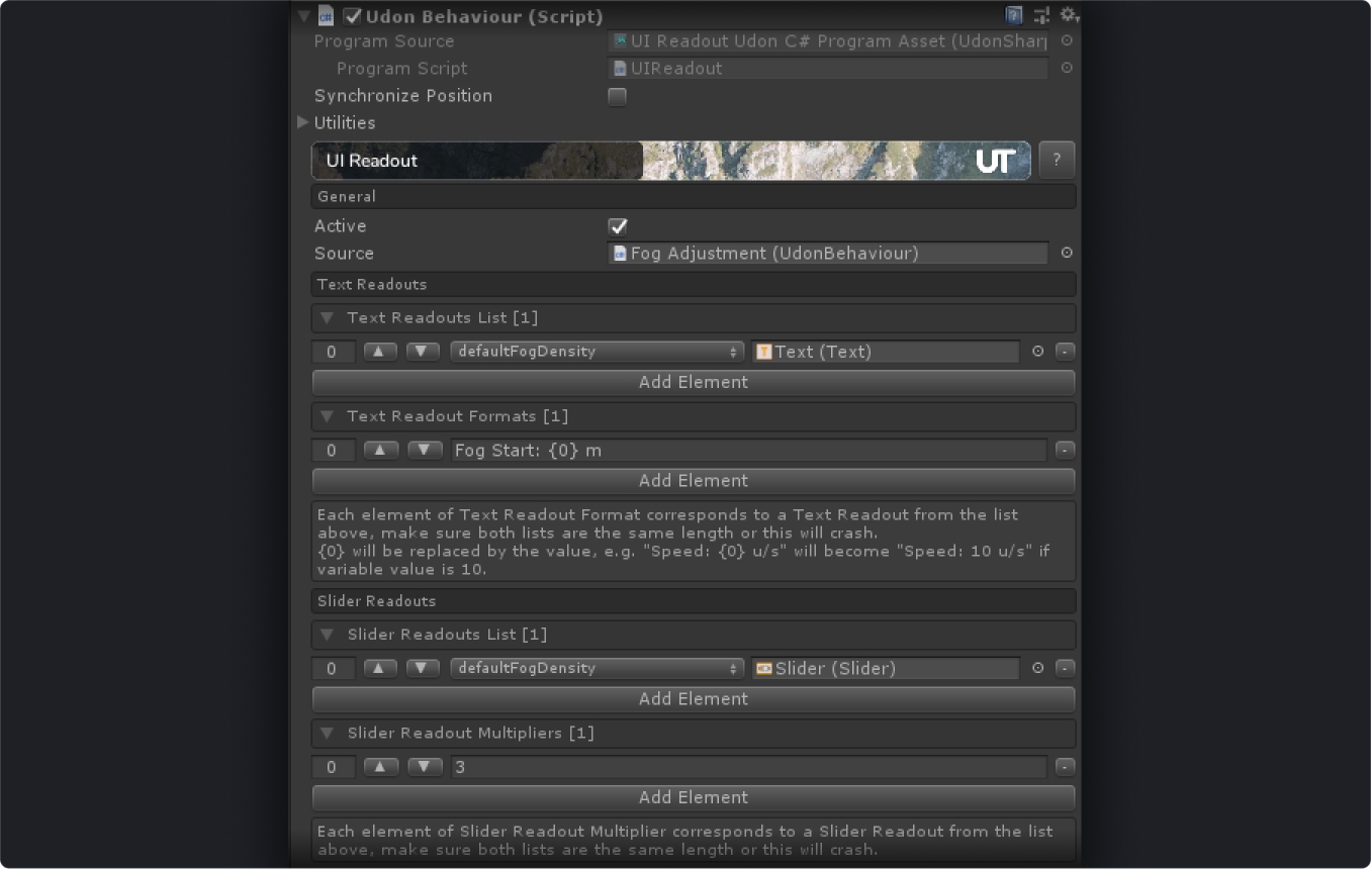 Important: always make sure Formats and Multipliers lists have at last as many elements as Text Readouts and Slider Readouts lists respectively. The UI should generate the lists for you filled with default values, but it doesn't hurt to double check. Each row of the Formats / Multipliers list corresponds to the same row in the Text/Slider lists.