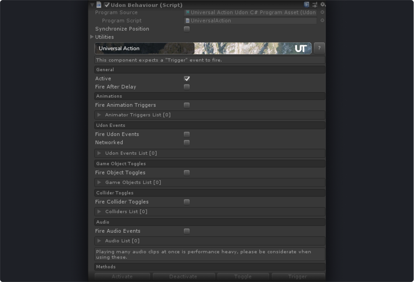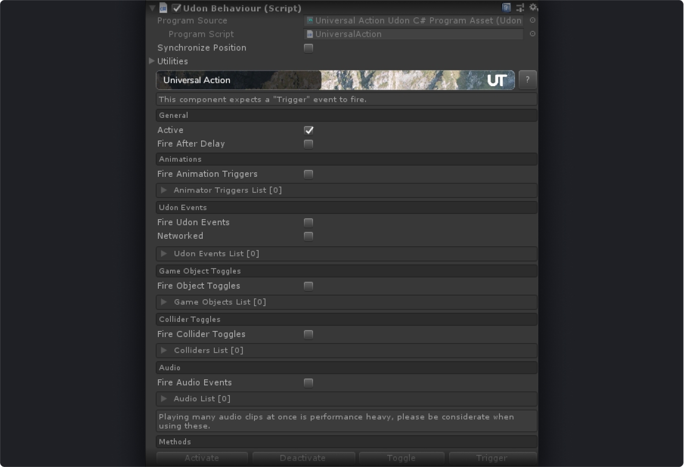 Universal Action will probably be the most used behaviour in your world, as its basically a simplified trigger from SDK2. It is not as deep as the original triggers, though, so you are expected to combine it with more specific behaviours from Udon Toolkit or other places to extend its functionality.