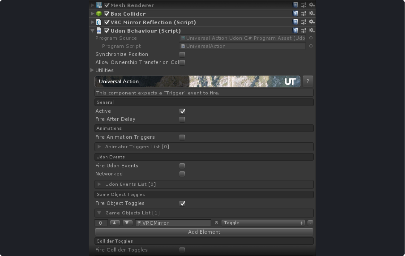 Activeis checked, checkFire Object Toggles, click on theGame Objects Listand clickAdd ElementDrag your Mirror object into the empty field, select