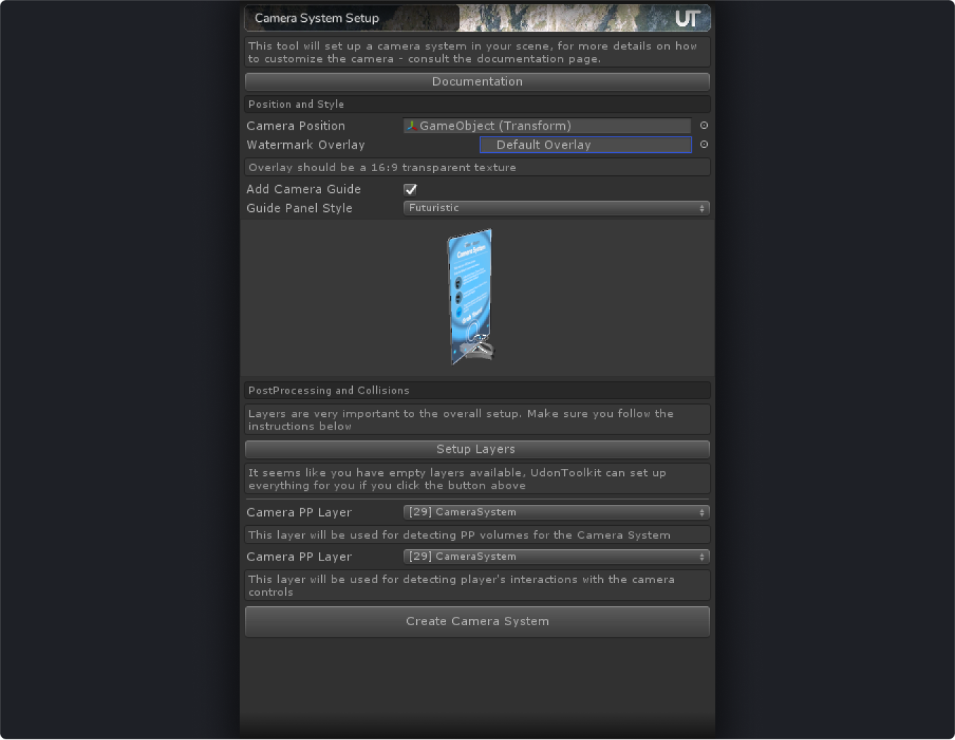 You are expected to use Camera System Setup UI from Window -> UdonToolkit -> Camera System Setup in the unity top bar to set everything up, consult the top of this page for the required steps. But here is a guide on the manual setup